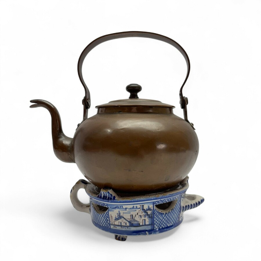 19e eeuwse koperen ketel op 19e eeuws Fries aardewerken komfoor