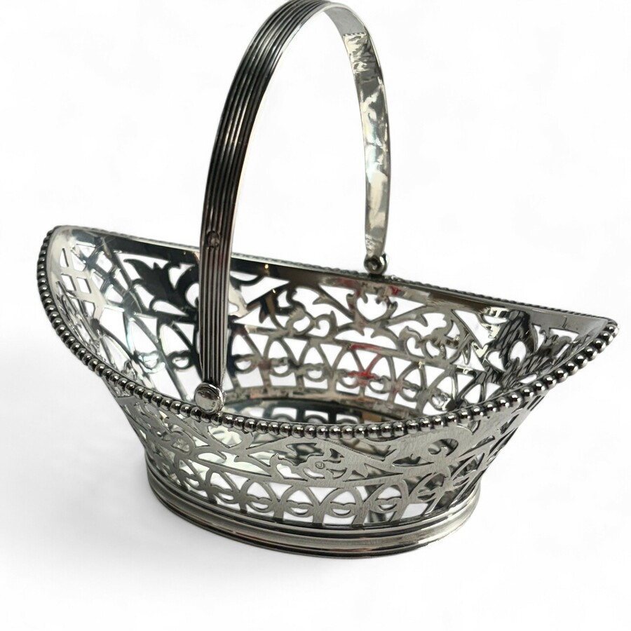 Een antiek zilveren bonbonmandje, ajour gezaagd en met hengsel. Aan de onderzijde gemerkt