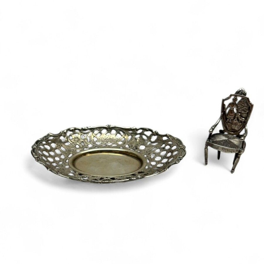 Zilveren schaaltje, tondeldoosje en miniatuur stoel