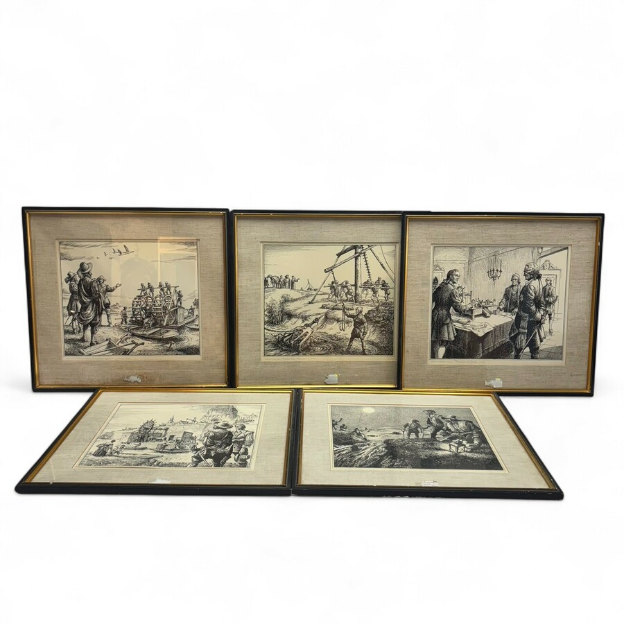 Vijf 20e eeuwse inkttekeningen, historische gebeurtenissen