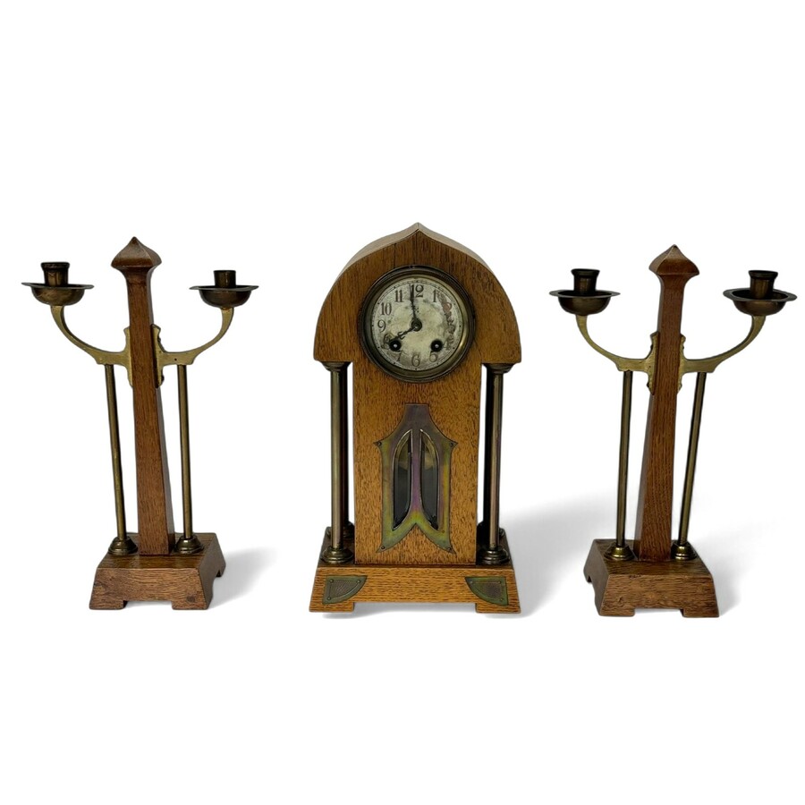 Lot met houten voeten stoof en drie koperen tulbandvormen.