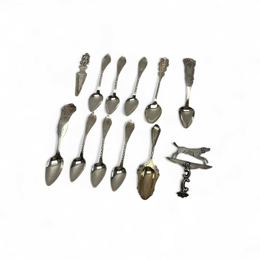 Lot divers tweede gehalte (835/1000) zilveren schepwerk, waaronder een set 19e eeuwse advocaatlepels met getorste steel en graveerwerk, en een montuur voor een zilveren schaaltje