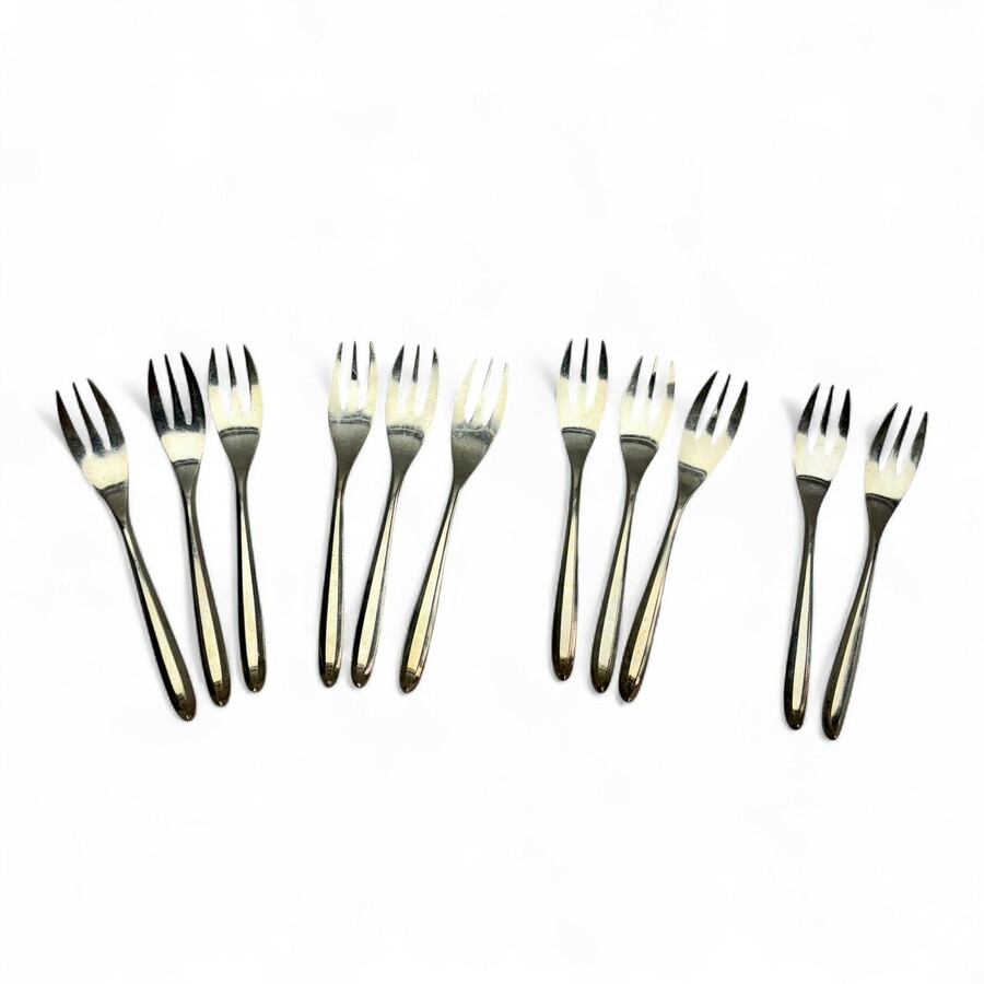 Een set van elf tweede gehalte (835/1000) zilveren gebaksvorkjes, strak model. Mr. van der Meulen, Joure.