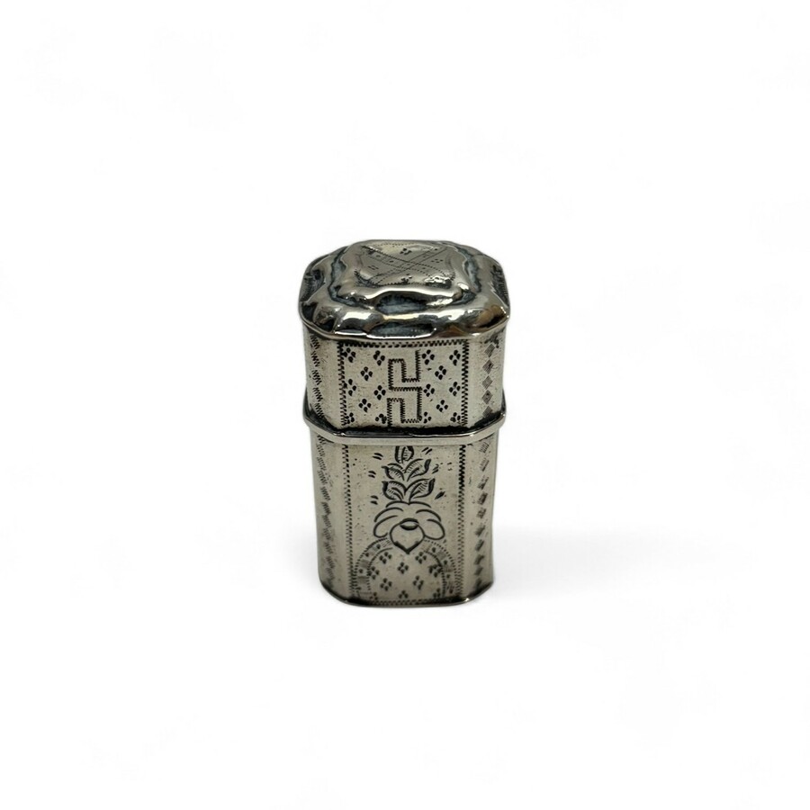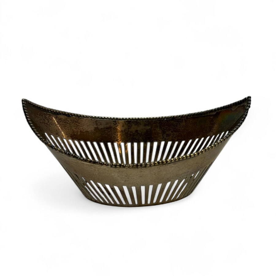 Een 20e eeuws tweede gehalte (835/1000) zilveren bonbonmandje. Schuitvomrig model, ajour gezaagd en met parelrand. Meesterteken ‘CC’, jaarletter 1903.