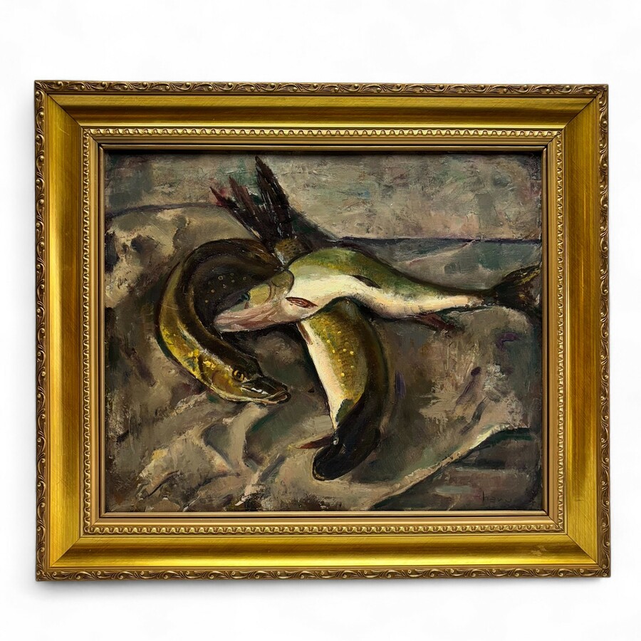 Schilderij, olieverf op doek. Stilleven met kabeljauw. Rechtsonder gesigneerd Piet Hanja (Tjimahi (Java) 1902 - Leeuwarden 1982). Verso met tekst '1948 tentoonstelling Haarlem'.