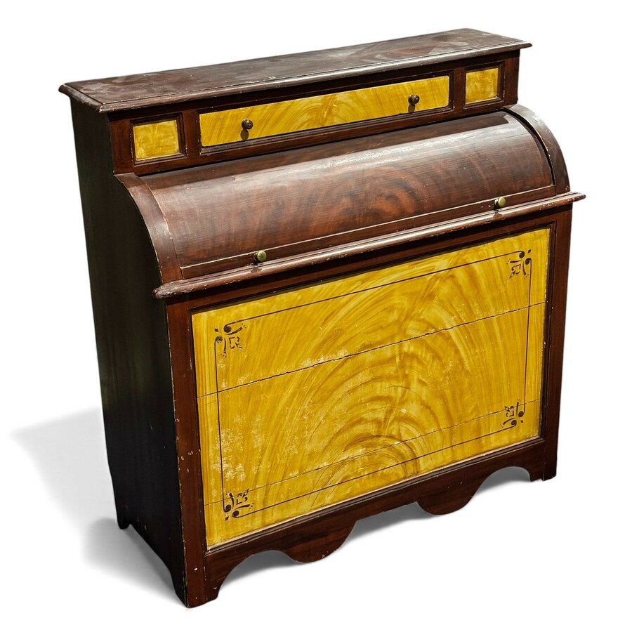 19e eeuwse houten turfkist met getoogde bovenklep en verfdecoratie in imitatie-houtnerf.