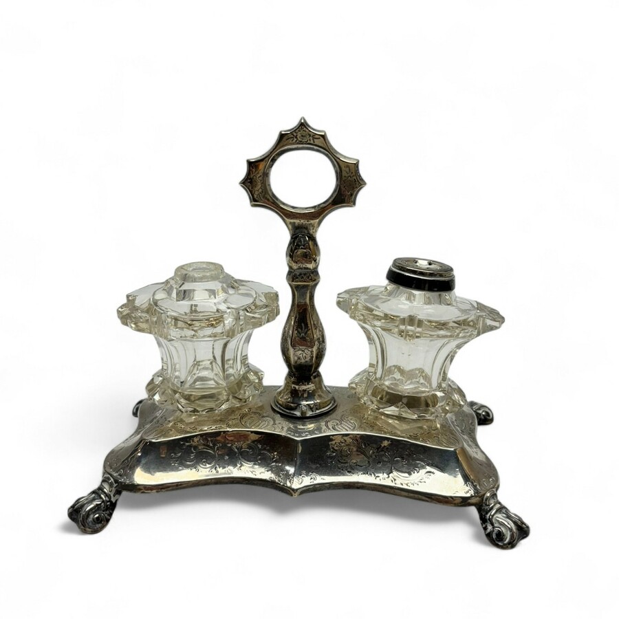 19e eeuws zilveren inktstel met kristallen inktpotjes