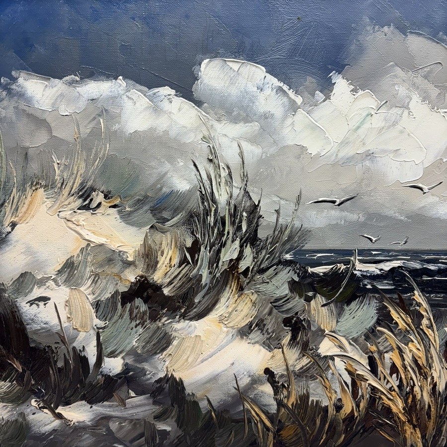 Gesigneerd HMS. (Hermanus 1955-2017) Schilderij voeten aan het strand.