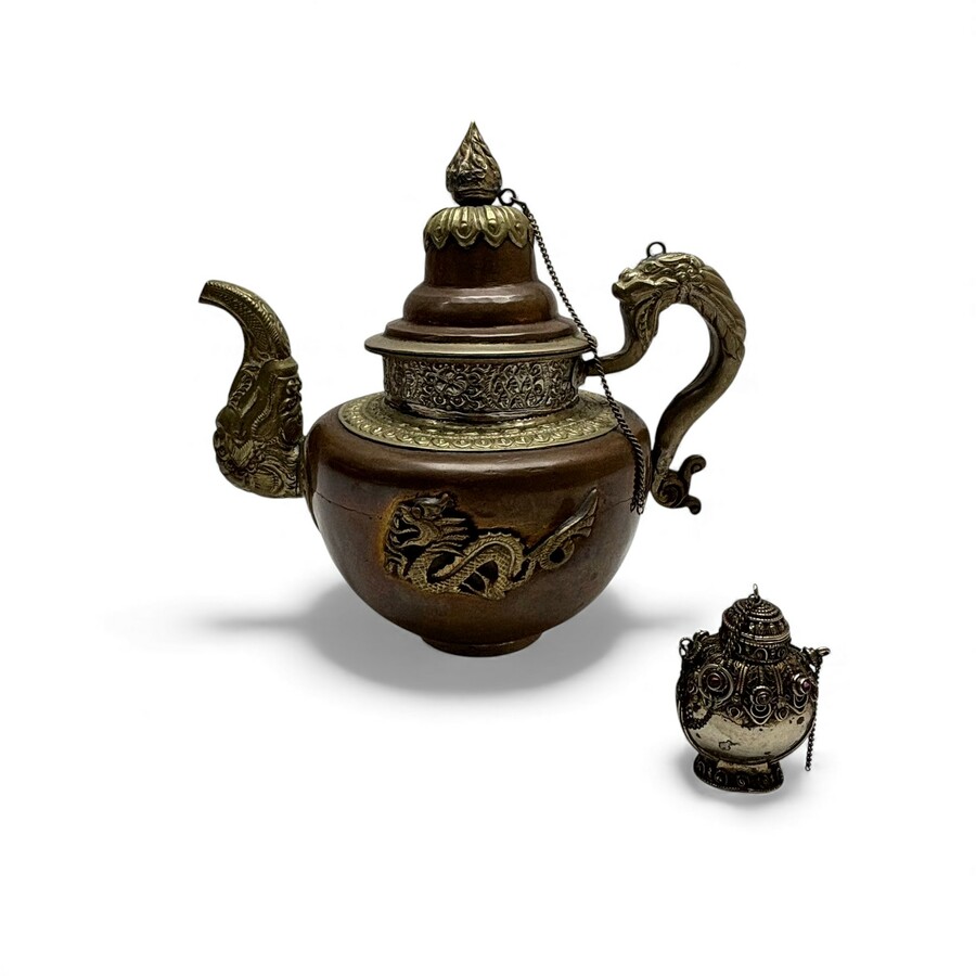 Tibetaanse koperen ketel met verzilverde rand en verzilverde parfumflacon