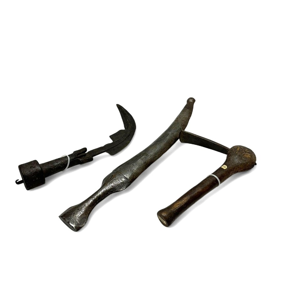 Een buitenlandse kortzwaard en twee stuks handgereedschap.