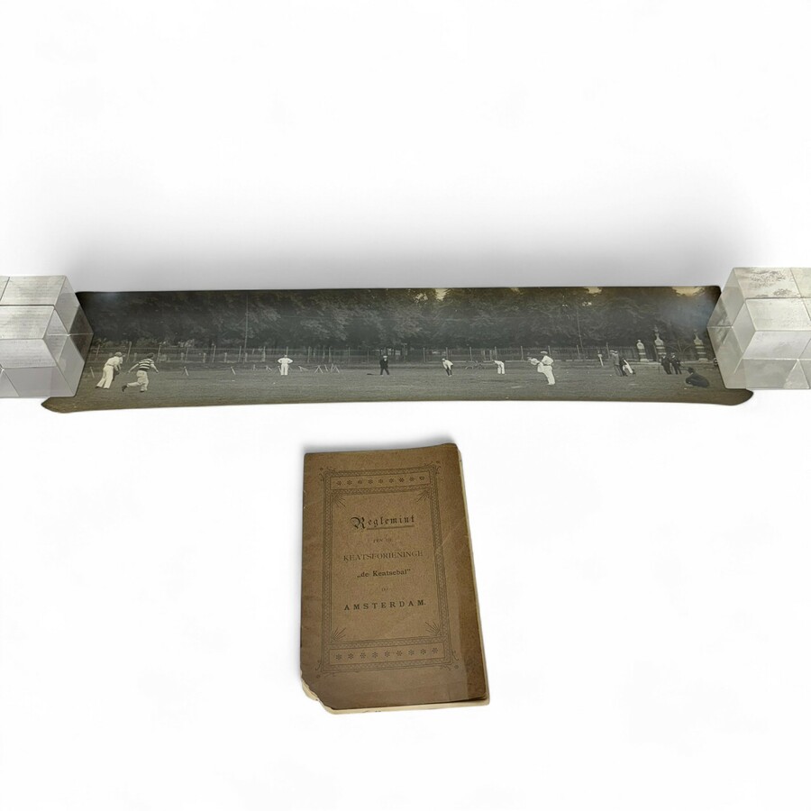 Boekwerk en reglemint fan de Keatsforieninge "De Keatsbal" to Amsterdam. Hierbij een panoramafoto van een kaatswedstrijd