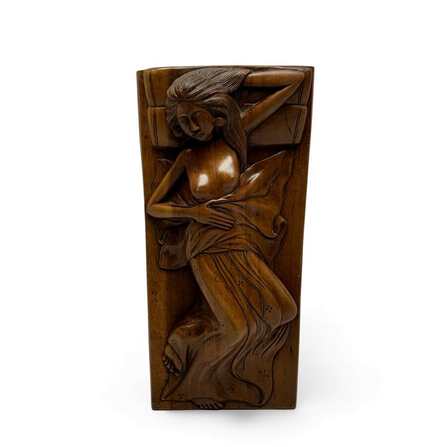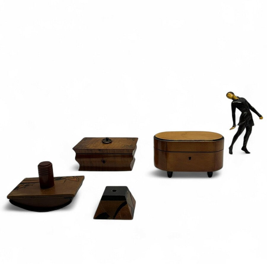 Lot diversen. Houten kistjes en een Art Deco sculptuur.