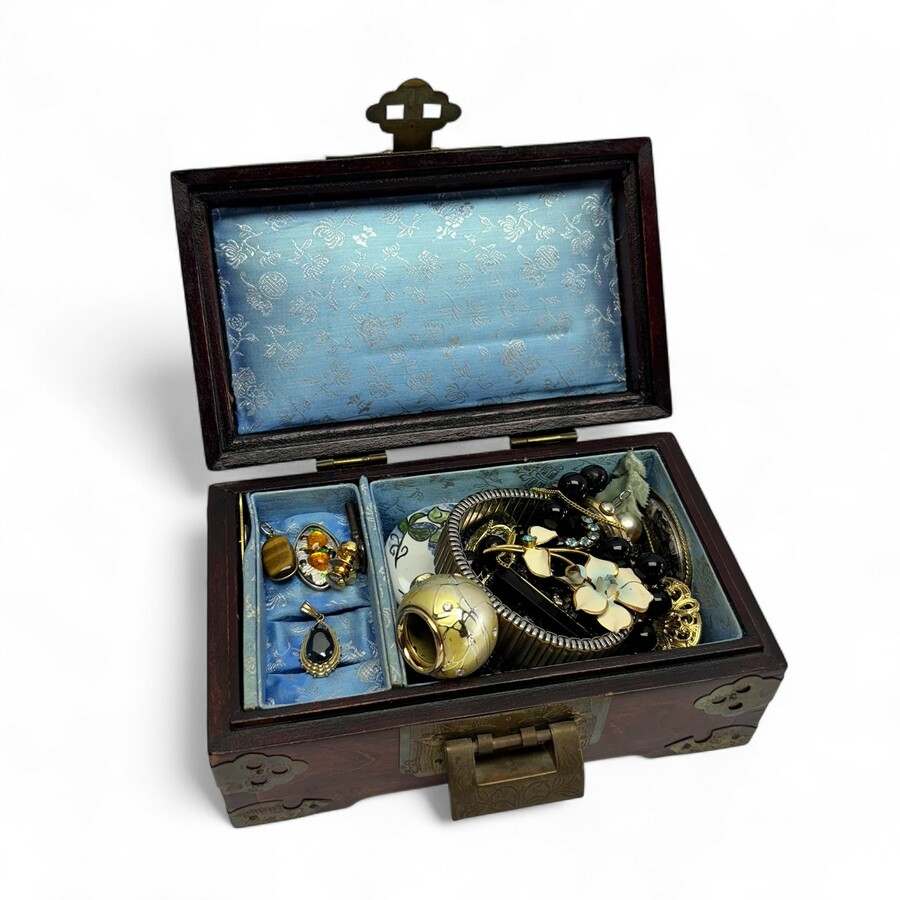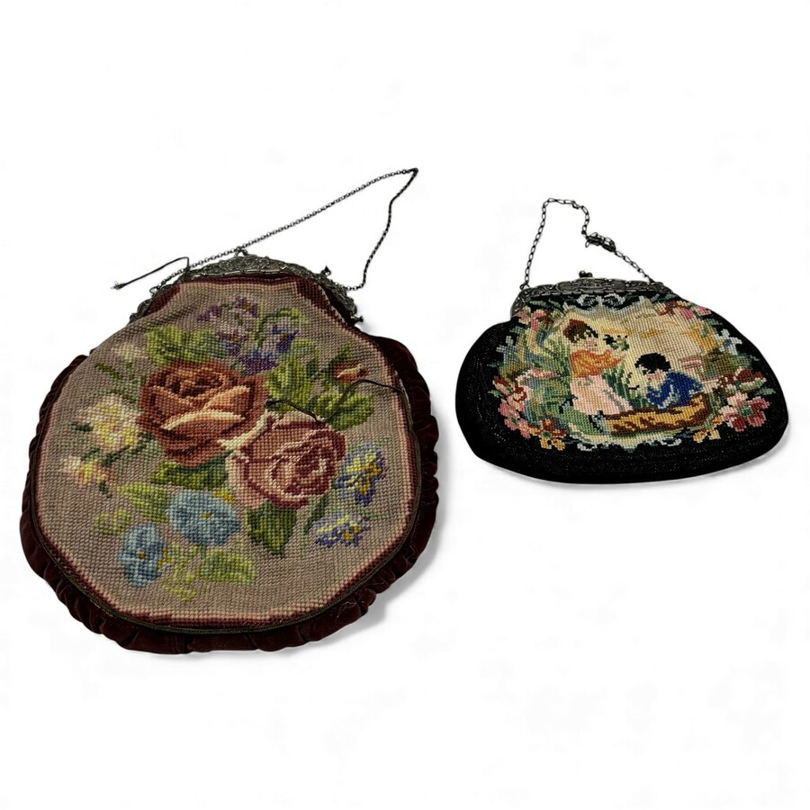 Twee zilveren tasbeugels aan geborduurde tasjes