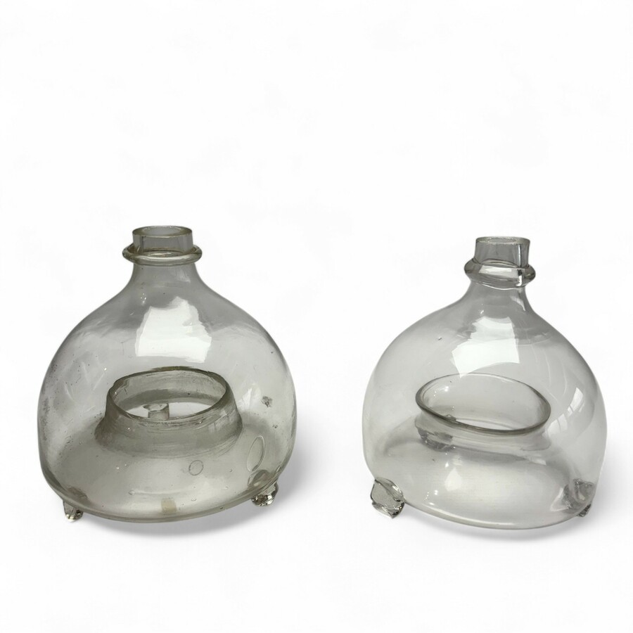Een Terracotta kogelpotje en een glazen olieflesje.