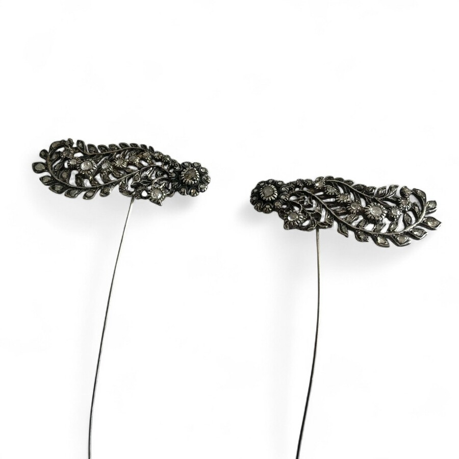 Twee antieke 19e eeuwse oorijzerspelden met roosgeslepen diamant, zgn. Friese veren