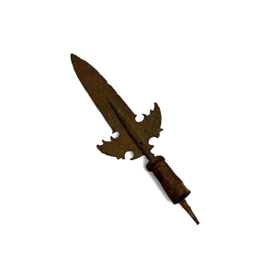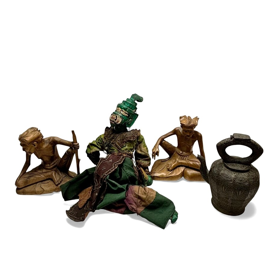 Twee teakhouten Indische sculpturen, een messing ketel en een antieke Birmese marjonetten pop.