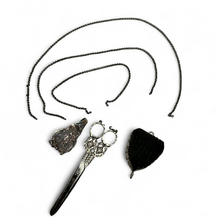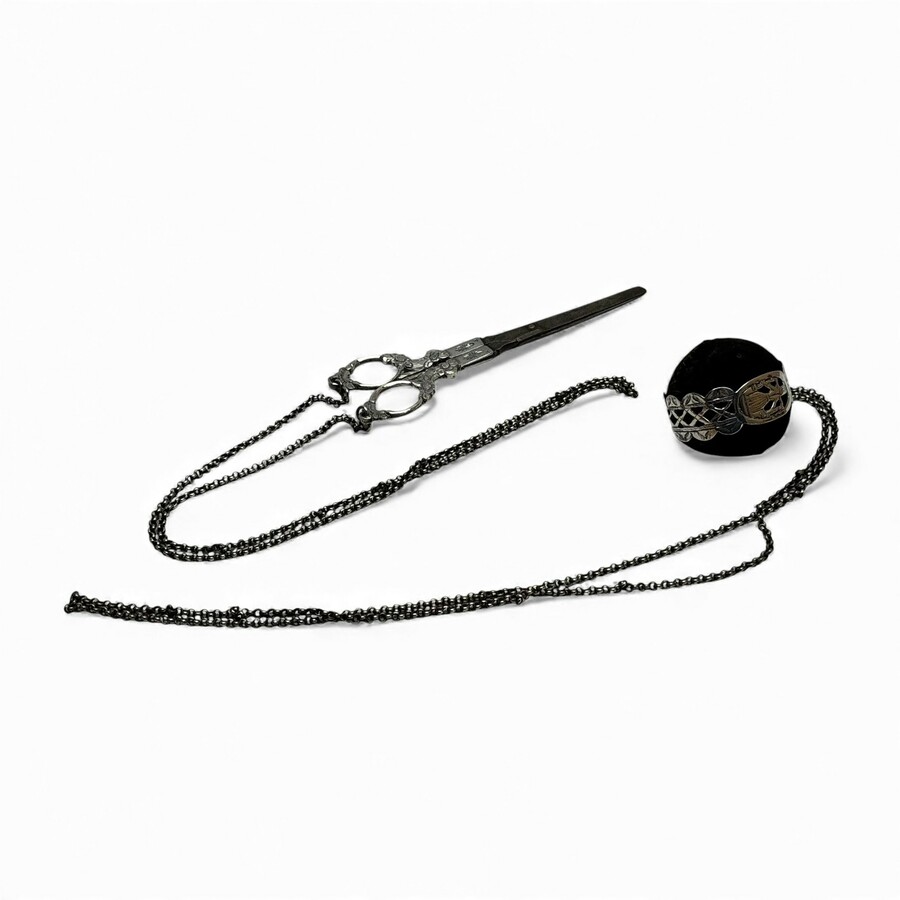 19e eeuwse zilveren naaischaar en speldenkussen, beide aan jasseroncollier