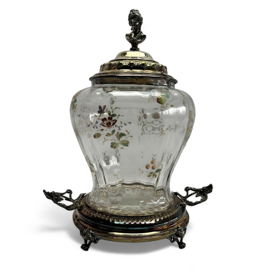 19e eeuwse glazen bowlpot met verzilverde deksel en onderschotel