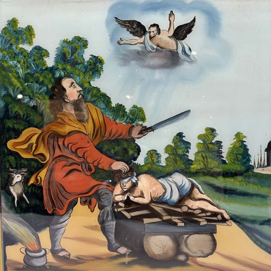 19e eeuwse volkskunst achterglasschildering, Abrahams offer
