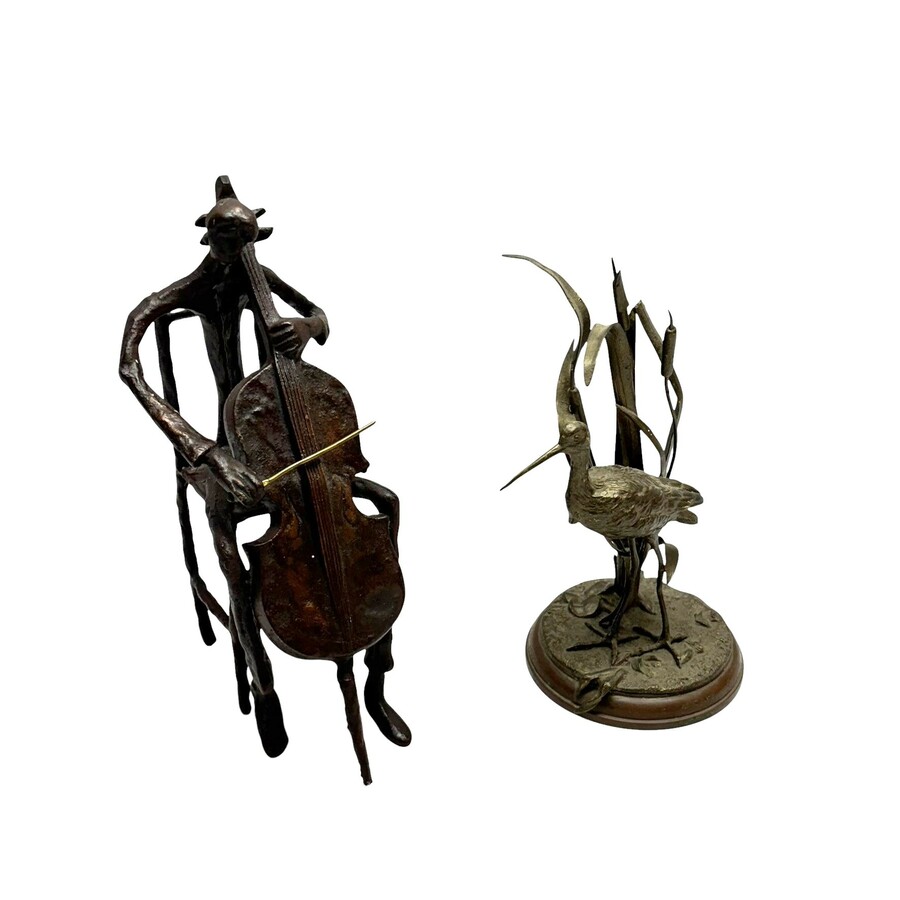 Twee sculpturen, vioolspeler en ooievaar tussen het riet.