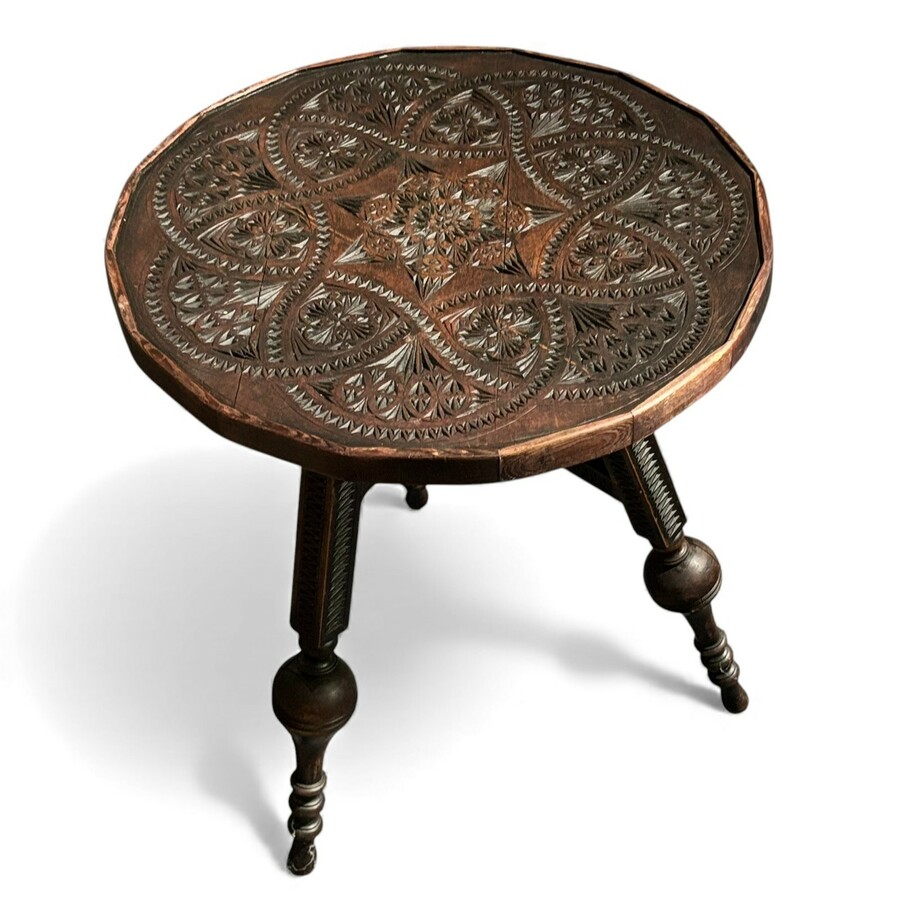 Een houten kerfsnede tafel, zgn flap aan de wand.