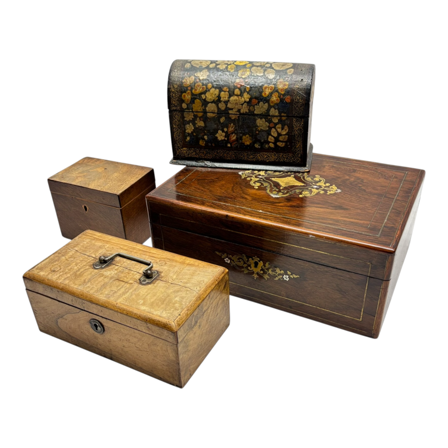 Vier antieke kistjes, waarvan drie van hout en één van papiermaché