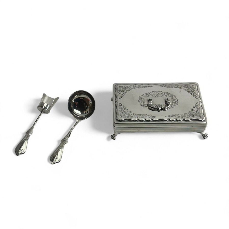 Een zilveren lepeldoosje met 12 zilveren lepeltjes, suikerschepje en roomlepel, gemerkt Niekerk, Schoonhoven
