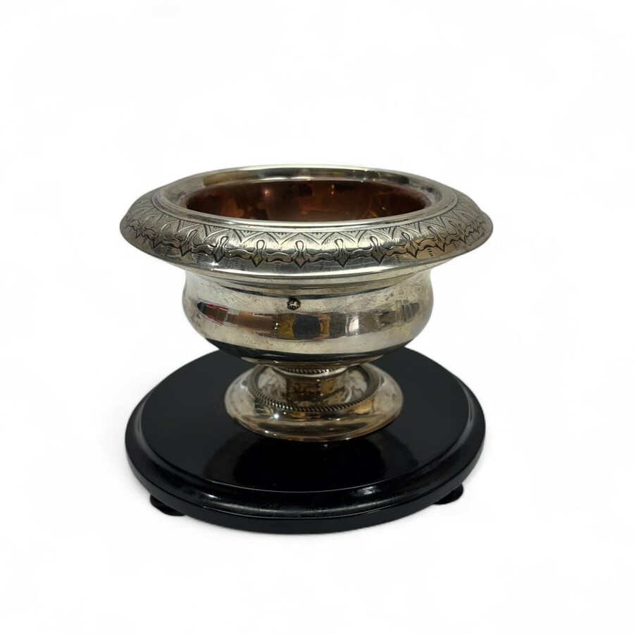 Rond zilveren pijpkomfoor met koperen binnenbak.