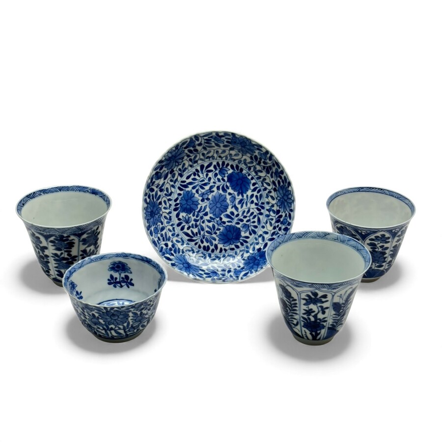 Lot van KangXi Chinees porseleinen, vier koppen en 1 schoteltje.