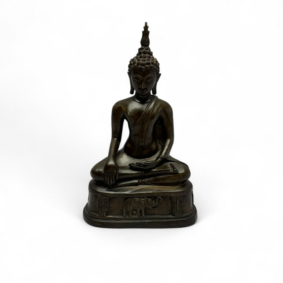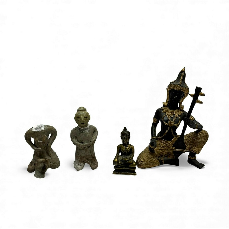 Twee Mingqi grafbeeldjes en twee bronzen boeddha's