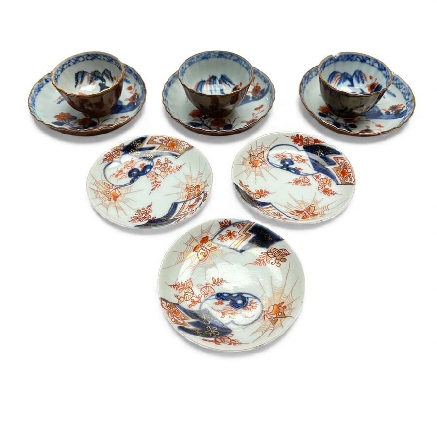 Drie 18e eeuwse capucijner imari kop en schotels en drie 18e eeuwse Japanse schoteltjes
