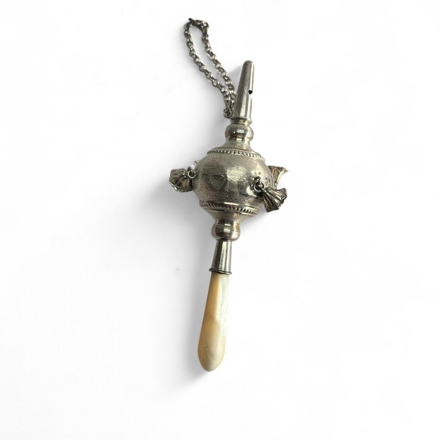Antieke 19e eeuwse zilveren rammelaar aan parelmoeren greep