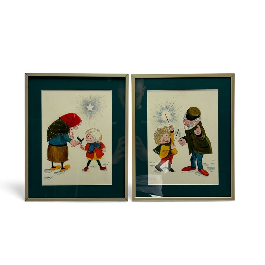Will Berg (1921-2001) - ‘Kerst met Oma’ en ‘jaarwisseling met opa’, originele illustraties voor Okki
