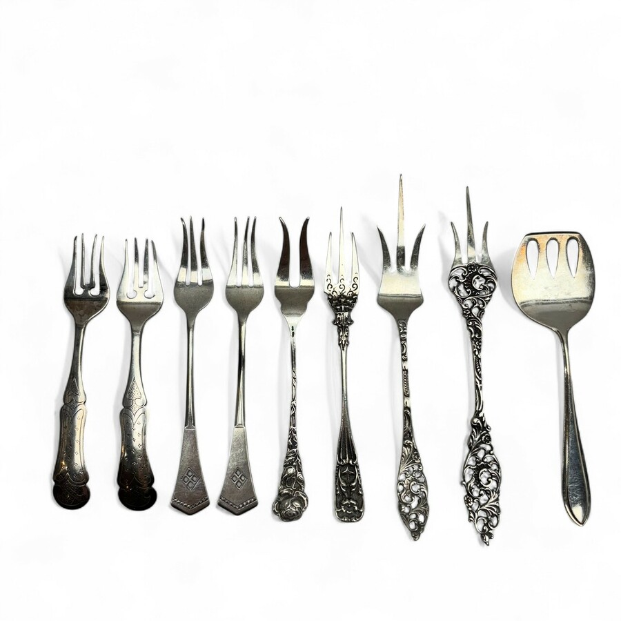 Lot zilveren vleesvorkjes, cakevorkjes en tafelschuivertje (9x)