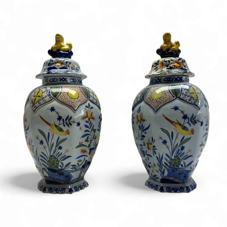 Twee zeskantige Tichelaar dekselvazen, ca. 1900