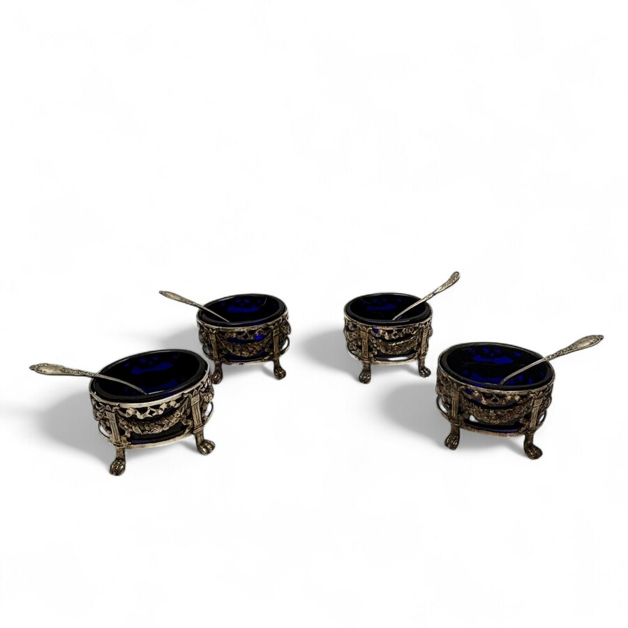 Vier Duits zilveren zoutvaatjes met lepeltjes