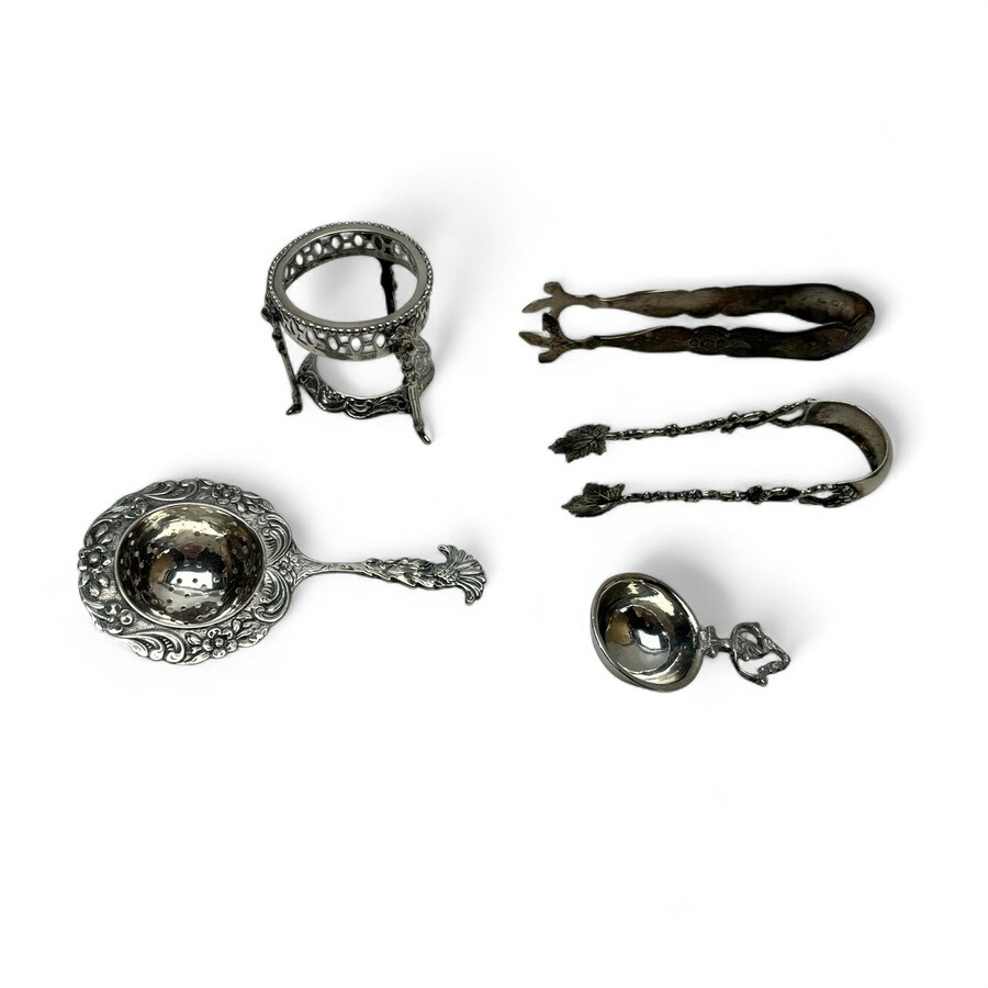 Twee zilveren klontjestangen en theezeefje op onderstel