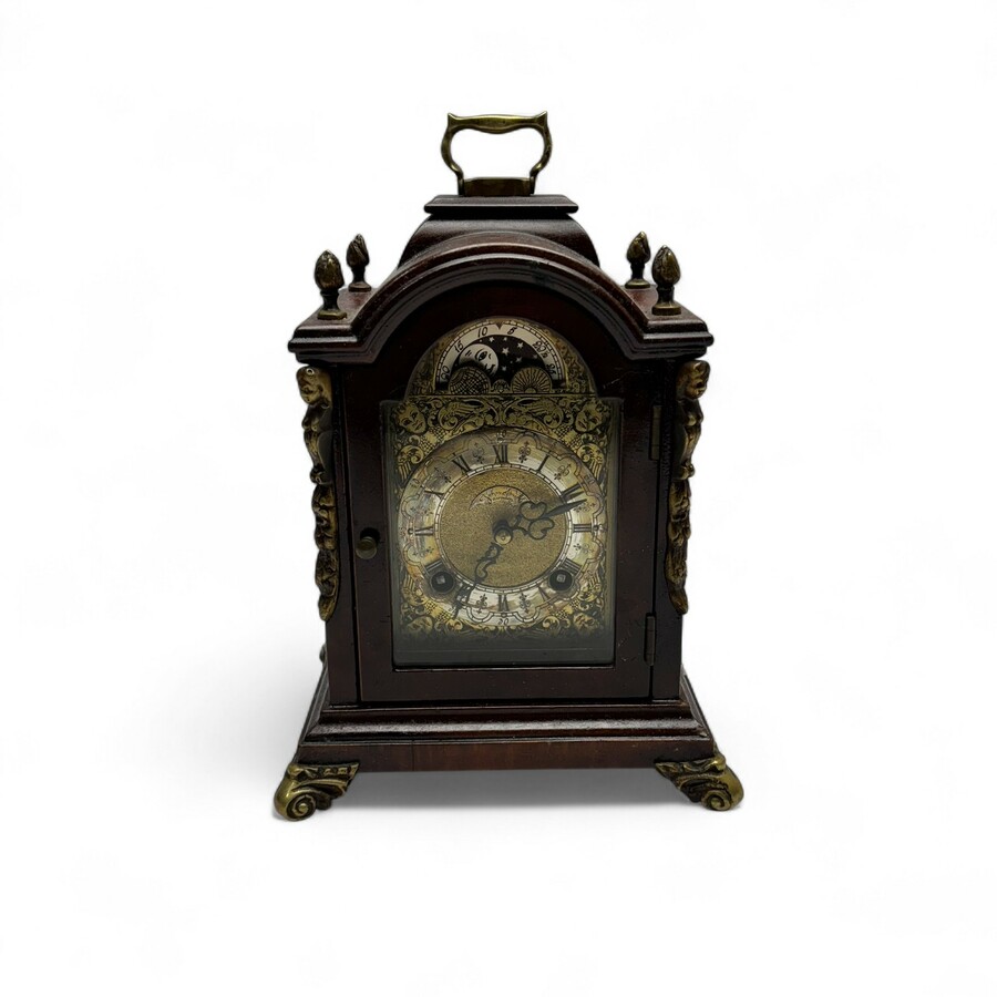 Een tafeklokje in notenhouten kast.