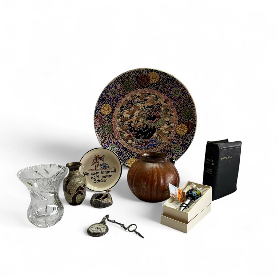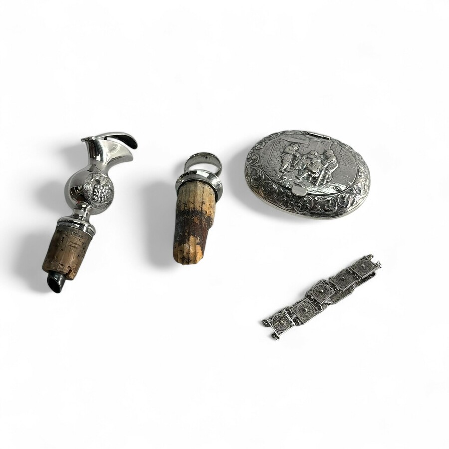 Lot divers: een antiek zilveren snuifdoosje met herbergdecor, twee flessenstoppers en een eerste gehalte (925/1000) zilveren armband