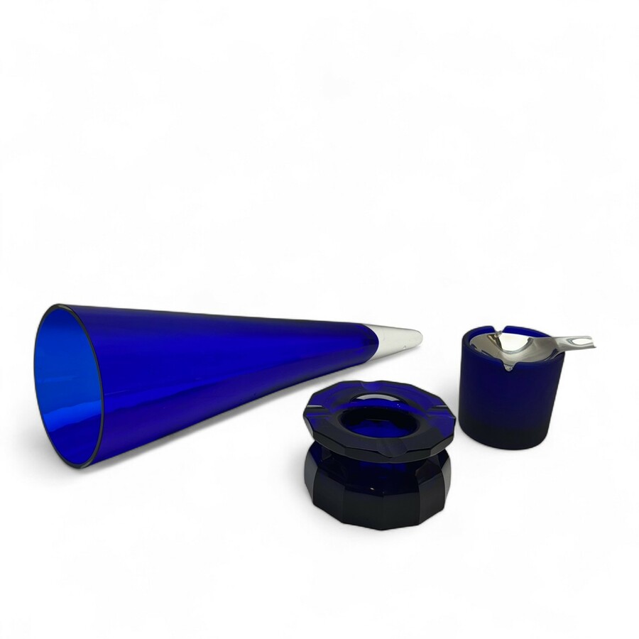 Lot met drie stuks blauw glaswerk. Oa asbak van Wilhelm Wagenfeld (1900-1990)
