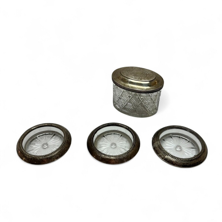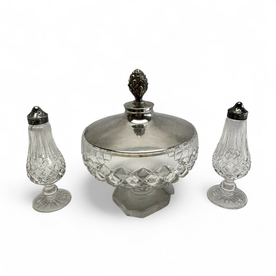 kristallen bonbonniere met zilveren deksel en peper en zout stel met platte doppen