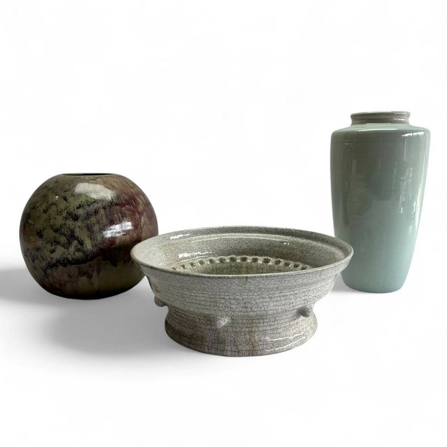 W.C. Brouwer, De rijn, Leiderdorp en niet gemerkt. Twee aardewerken vazen en een schaal.