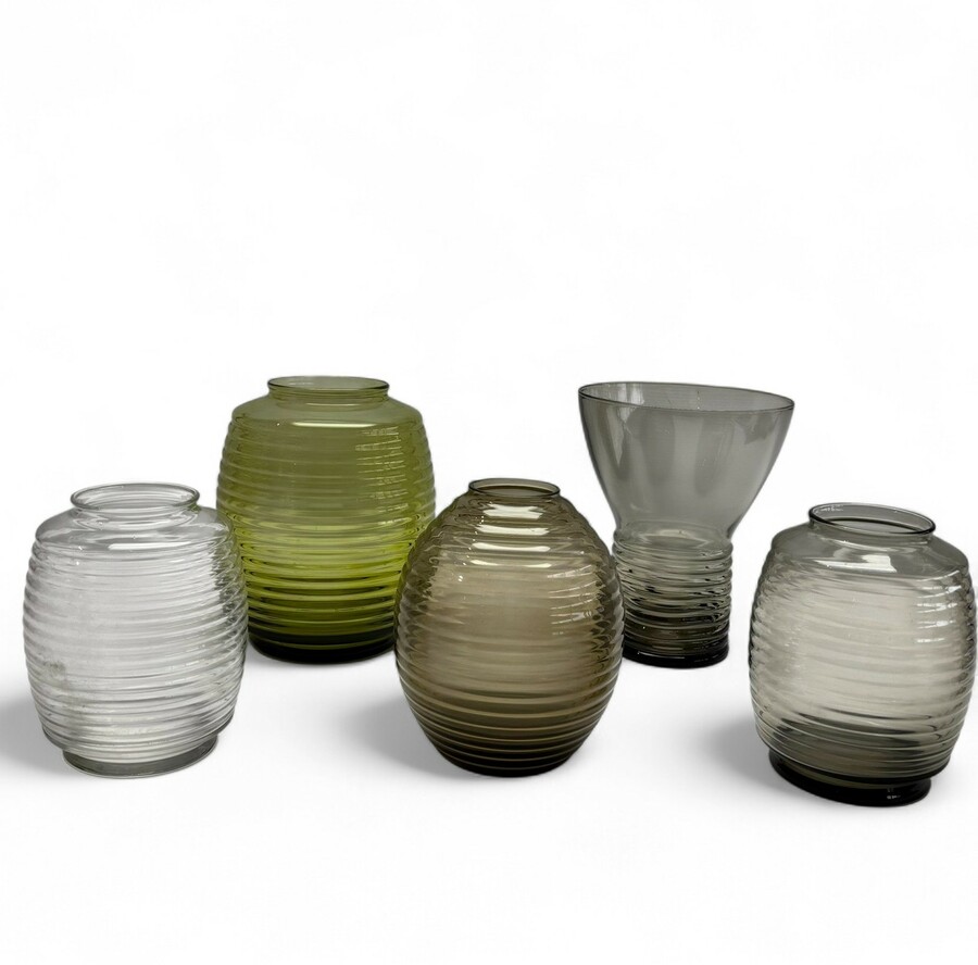 A.D. Copier. vijf Leerdam glazen ribbelvazen.