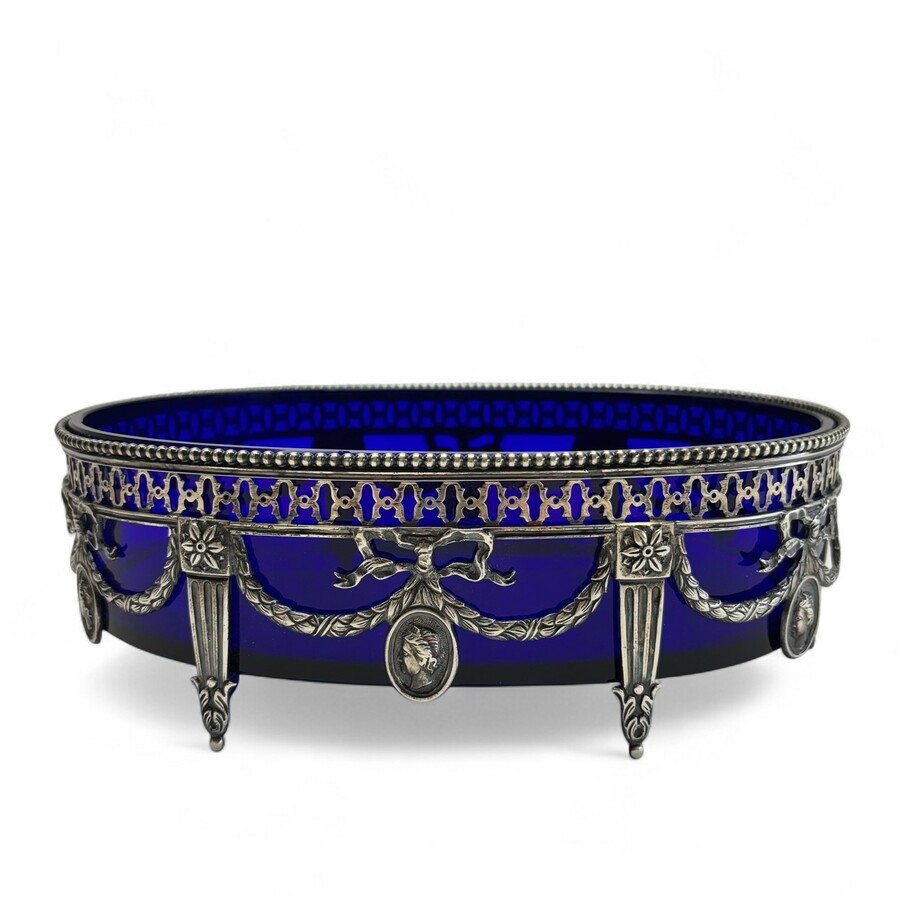 Zilveren jardiniere met blauwglazen binnenbak