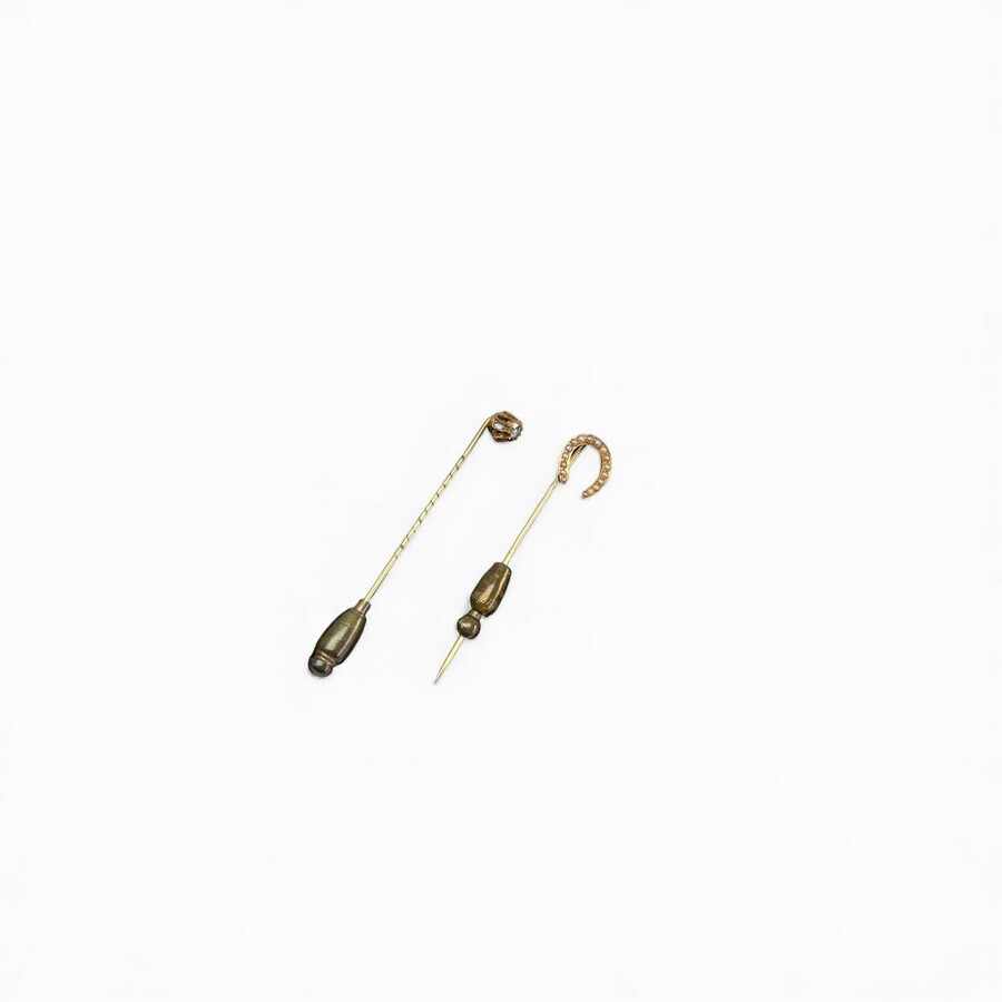 Twee gouden dasspelden met zaadparel en diamant