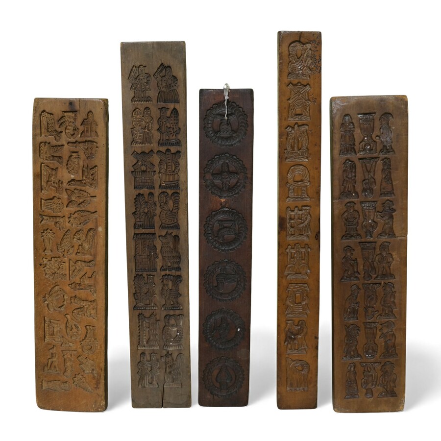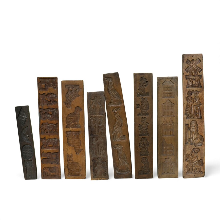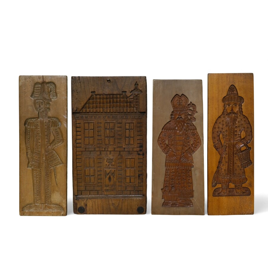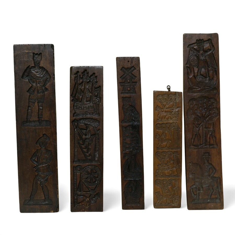 Lot koekplanken met onder andere een voorstelling van een molen, een vis en diverse personen en figuren.