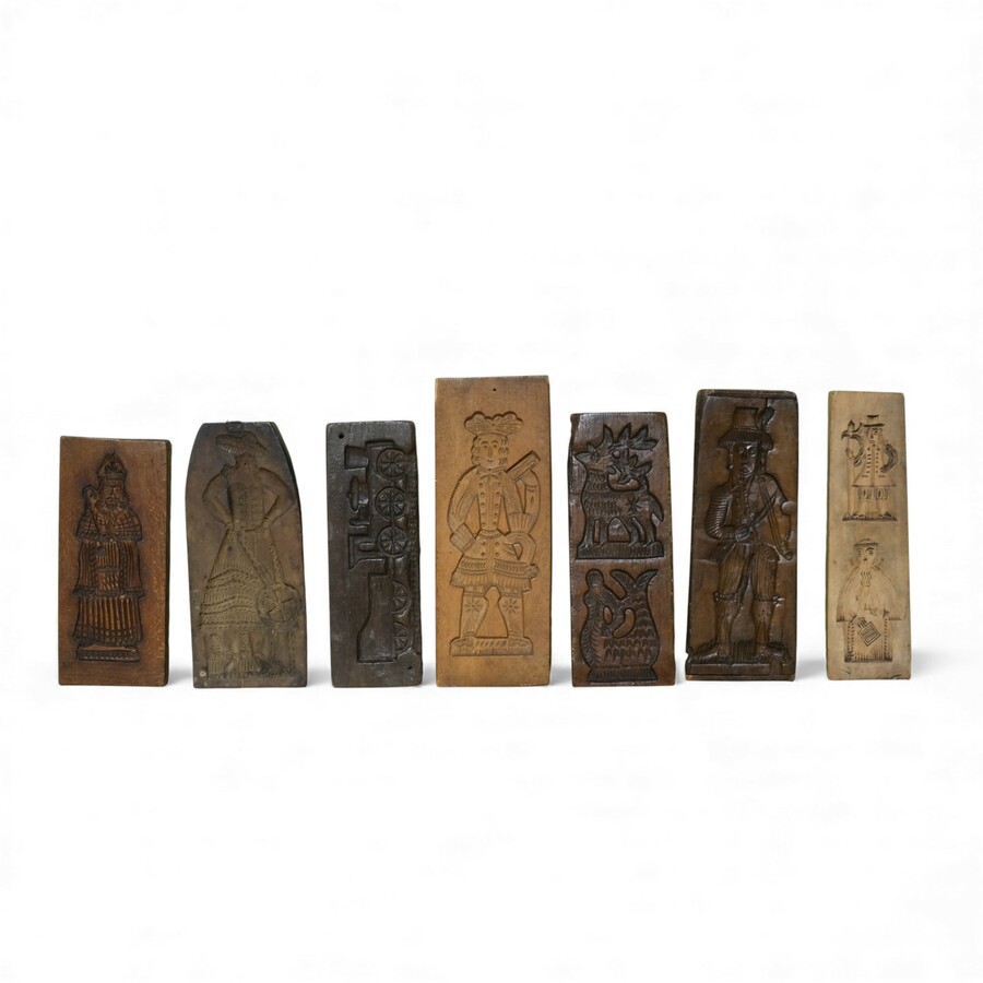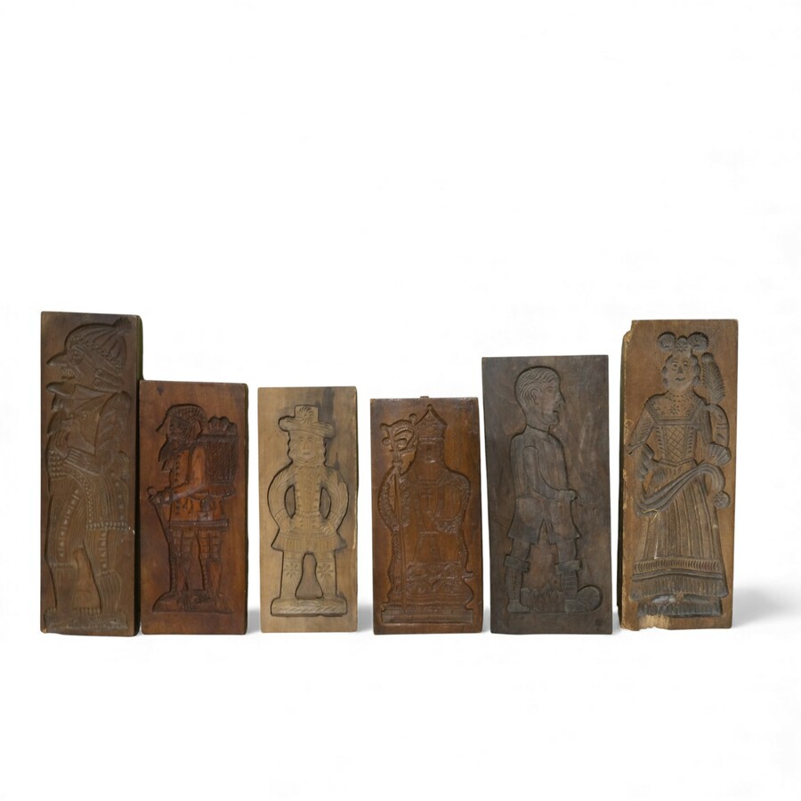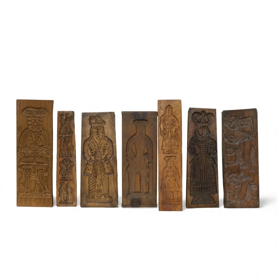 Lot koekplanken met onder andere een voorstelling van een man en vrouw, een koningin, verschillende zakelijk geklede mannen en rijtuigen.