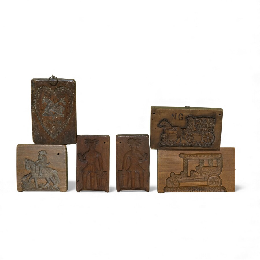 Lot koekplanken met onder andere een voorstelling van paard en wagen, een auto, een paard, een ruiter en paard en diverse personen. De plank met paard en wagen is gesigneerd NG.