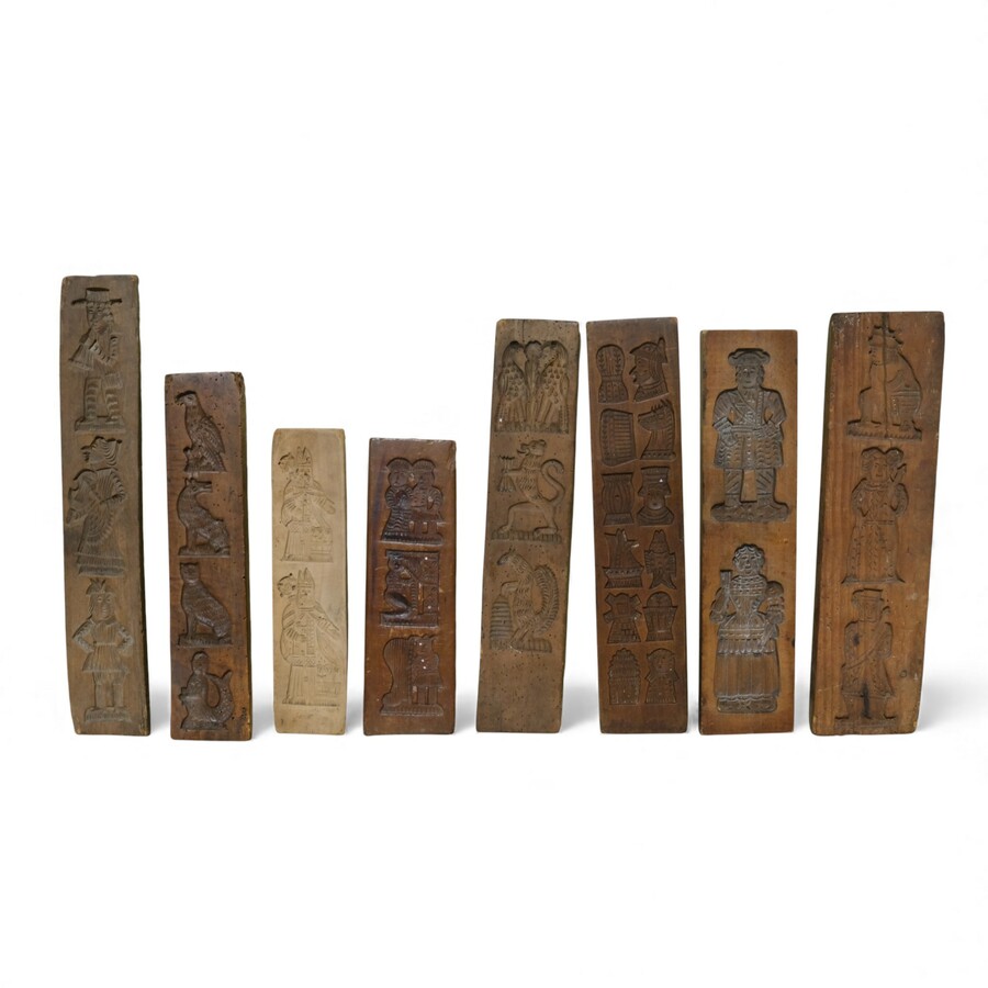 Lot koekplanken met onder andere een voorstelling een koningin, een vis, ruiter en paard, paard en wagen en diverse personen.