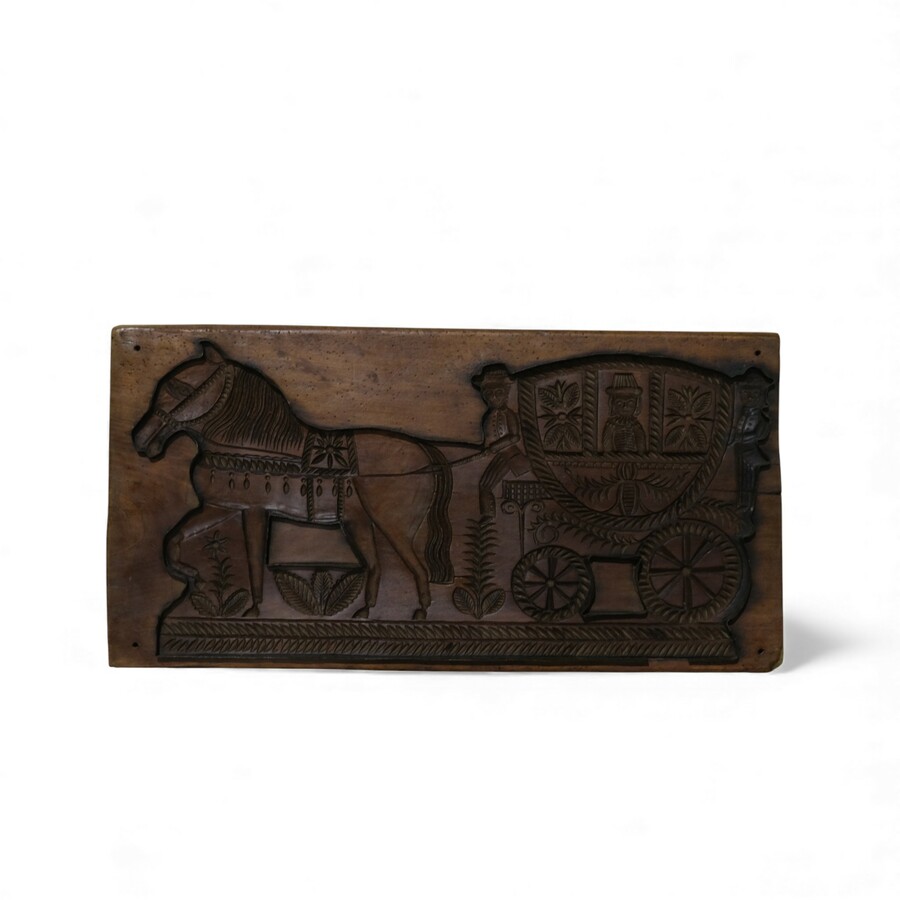 Eén grote koekplank met een voorstelling van een man in een paardenkoets. De koekplank is afgewerkt met een ijzere rand.